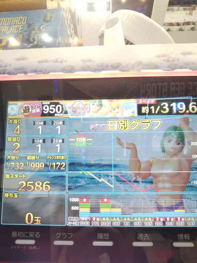遊タイム350回転中、一度もリーチなし。そのちょい前は遊タイムでこずに、1342回転で1回。トータル2642回転で1回+3回。その後、遊タイムまでいき、リーチが一度もかからず。
