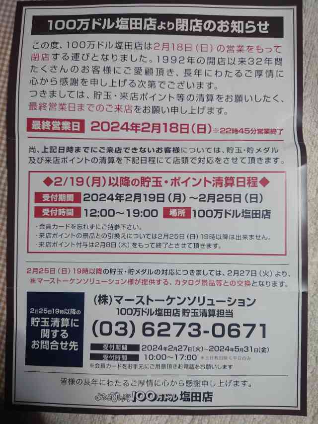 100万ドル塩田店 長野県 長野県上田市神畑乙142-2 [地図] 投稿数 1件 この店舗に関する投稿 2024年2月9日 7:56 #1 匿名 GC5RxEpGさん 2024年2月18日で遂に閉店。 一時代を築いた塩万。 昨今のパチ離れでダメだったんかな。 次は小諸も閉店予定らしい。 さようなら塩万。ありがとう塩万。 この店舗に関することを投稿する この店舗に関する情報、出来事、画像などを投稿しよう! この店舗を評価する ※評価は1店舗1日1回までです。 ※評価がない場合は評価としてカウントされません。 任意入力欄 ※8文字まで 画像もアップしよう! ・プレミア画像 ・連チャン画像 ・ハマり画像 ・低設定・高設定グラフの画像 ・設定示唆演出の画像 などの画像も合わせて投稿しよう。 画像を取り消す 投稿ルール 本サービスはパチンコ・スロット専用のコミュニティサイトです。本サービスに関係のない内容または画像、誹謗中傷するような投稿内容は運営側で削除致します。またその他不適切な内容・表現だと運営側で判断した場合も投稿を削除致します。 迷惑行為はおやめください。本サービスにとって迷惑になる、また他の利用者にとっても迷惑になると運営側が判断した場合は利用を規制させて頂く場合がございます。 簡単なルールの遵守が、気持ちのいい環境を生み出すことを判って下さい。 画像募集中! 店舗の外観がわかる画像をお持ちの方は画像のアップロードを是非お願いします。 店舗のサムネイル画像として使わせていただきます。
